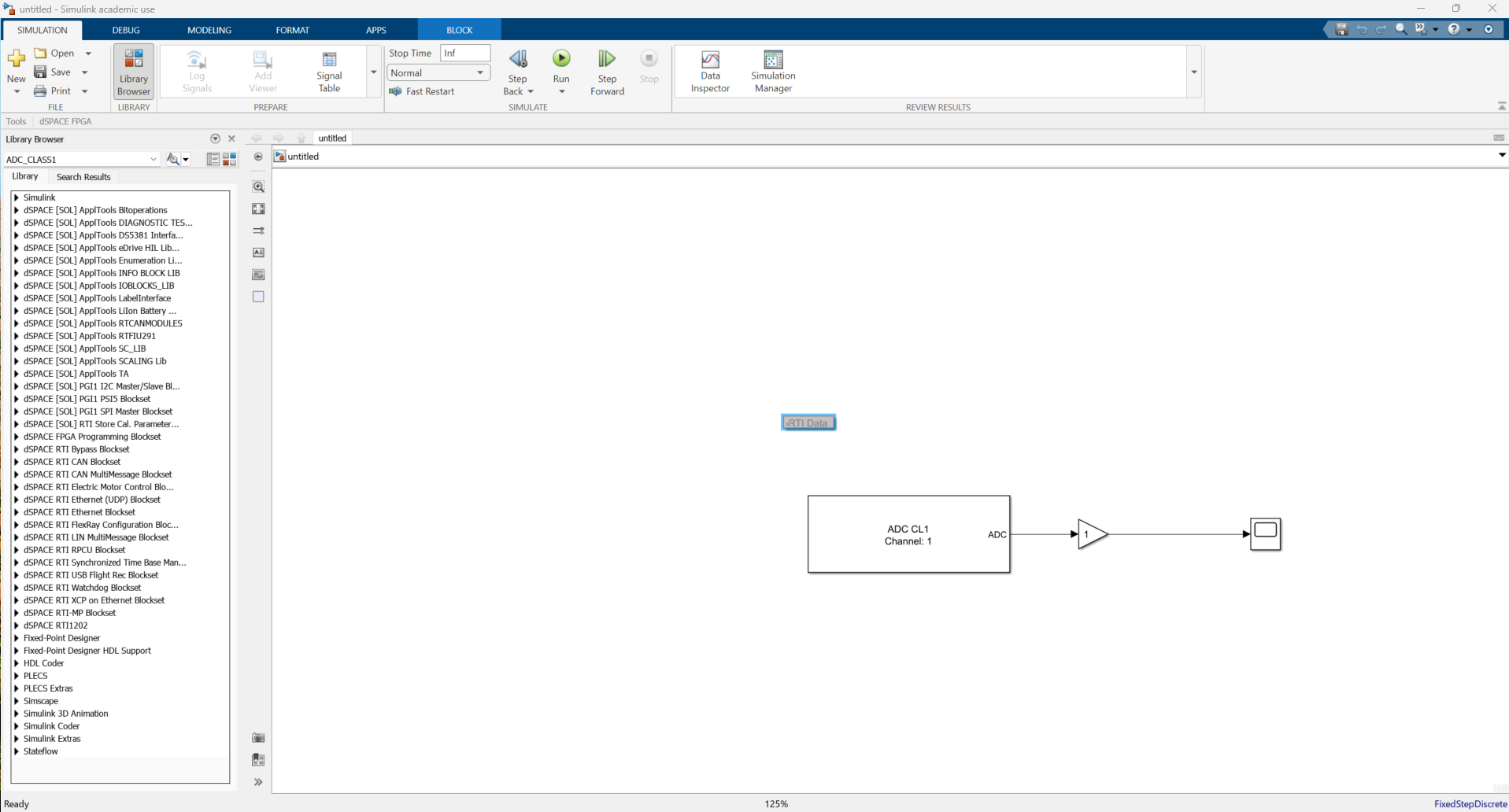 Make sure that Simulink model which you would like to build into MicroLabBox has the gray RTI Data block as shown in the above picture. Make sure the solver is discrete with a fixed-step size.