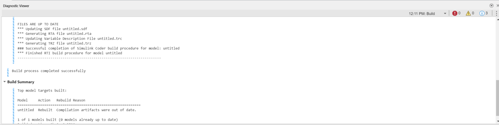 Now hit Ctlr+B to build the model and generate .sdf file. Simulink diagnostics screen should like below if everything is right order.