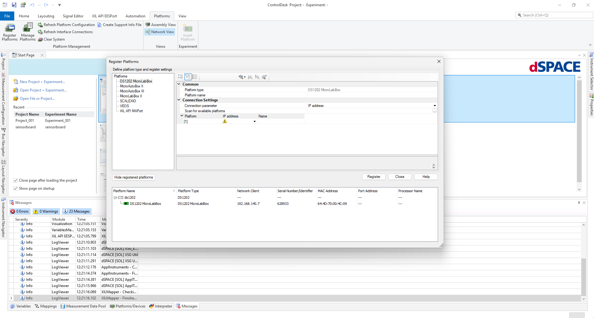 Make sure your computer is connected to MicroLabBox through ethernet and is accessible through its default IP address. Open ControlDesk and register MicroLabBox with the ControlDesk software like below. You can enter the IP for ControlDesk to access and register the MicroLabBox.