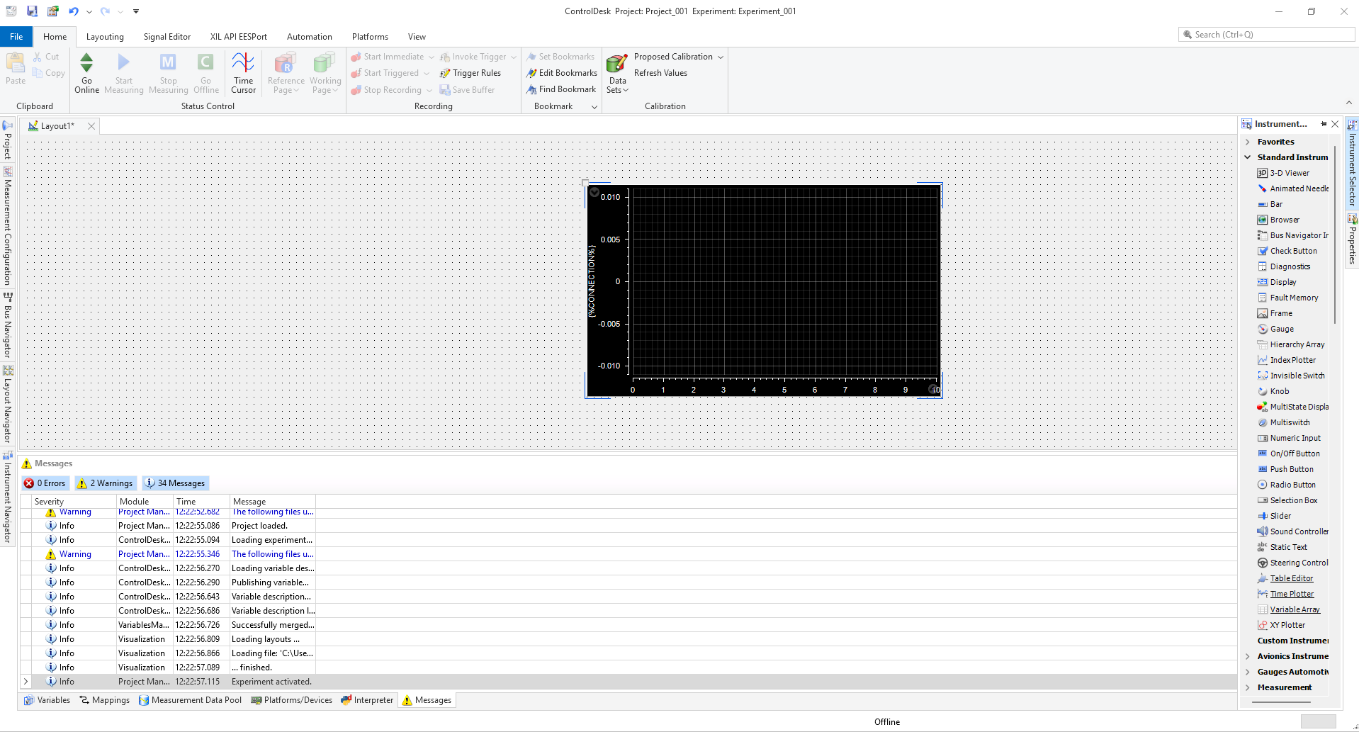 After selecting In1, now the Time Plotter know the right signal to track. To look at the signal in the plotter in real-time, hit Go Online  then hit Start Measuring at the top left corner shown below