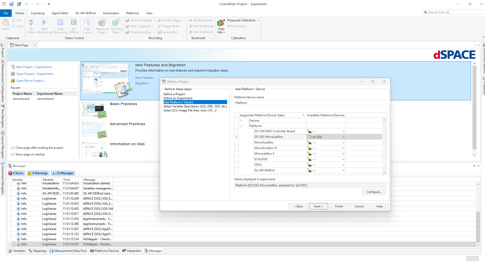 Now create a New Project + Experiment on ControlDesk. Then select the right MicroLabBox version.